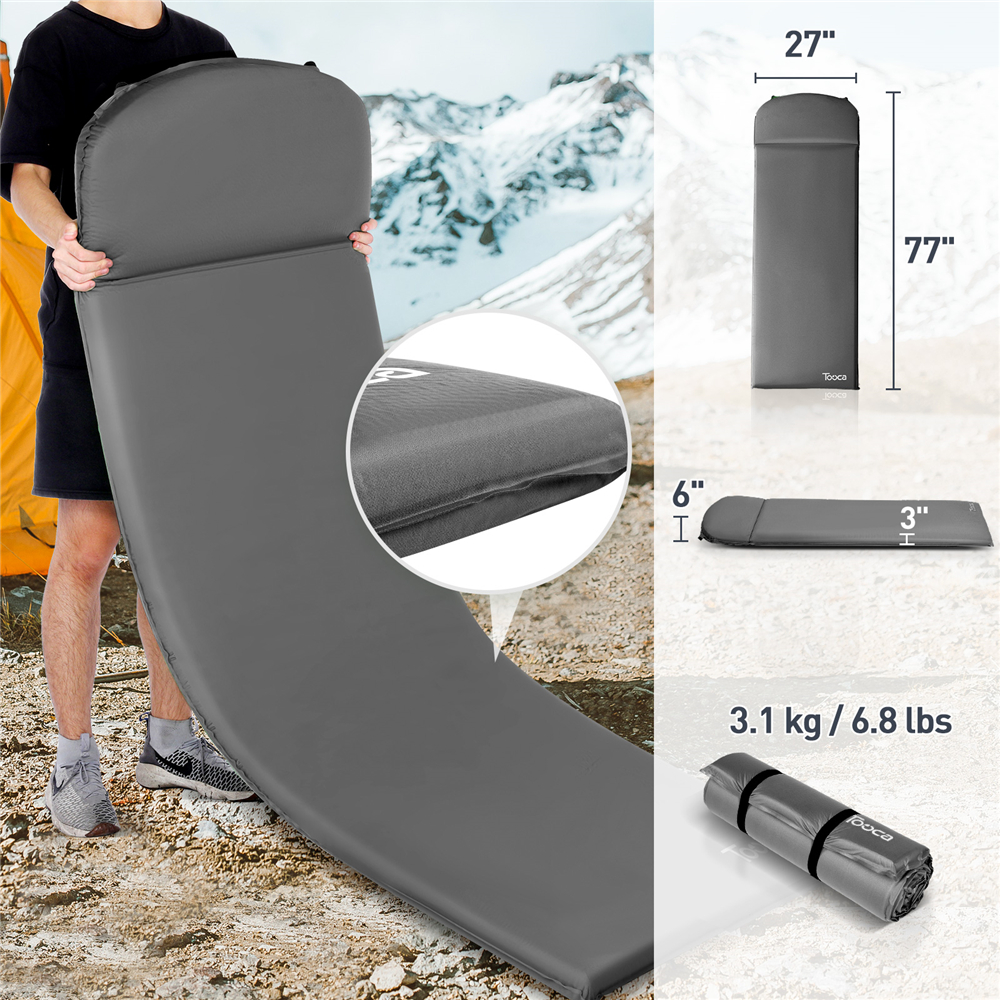 Sleeping pad size: 77"L x 27"W x 3~6"H. The Camping Sleeping Pad has a 6-inch soft built-in pillow, and there is a carrying bag in the package which is convenient for you. The camping sleeping pads are suitable for camping, hiking, picnics, beach parties.