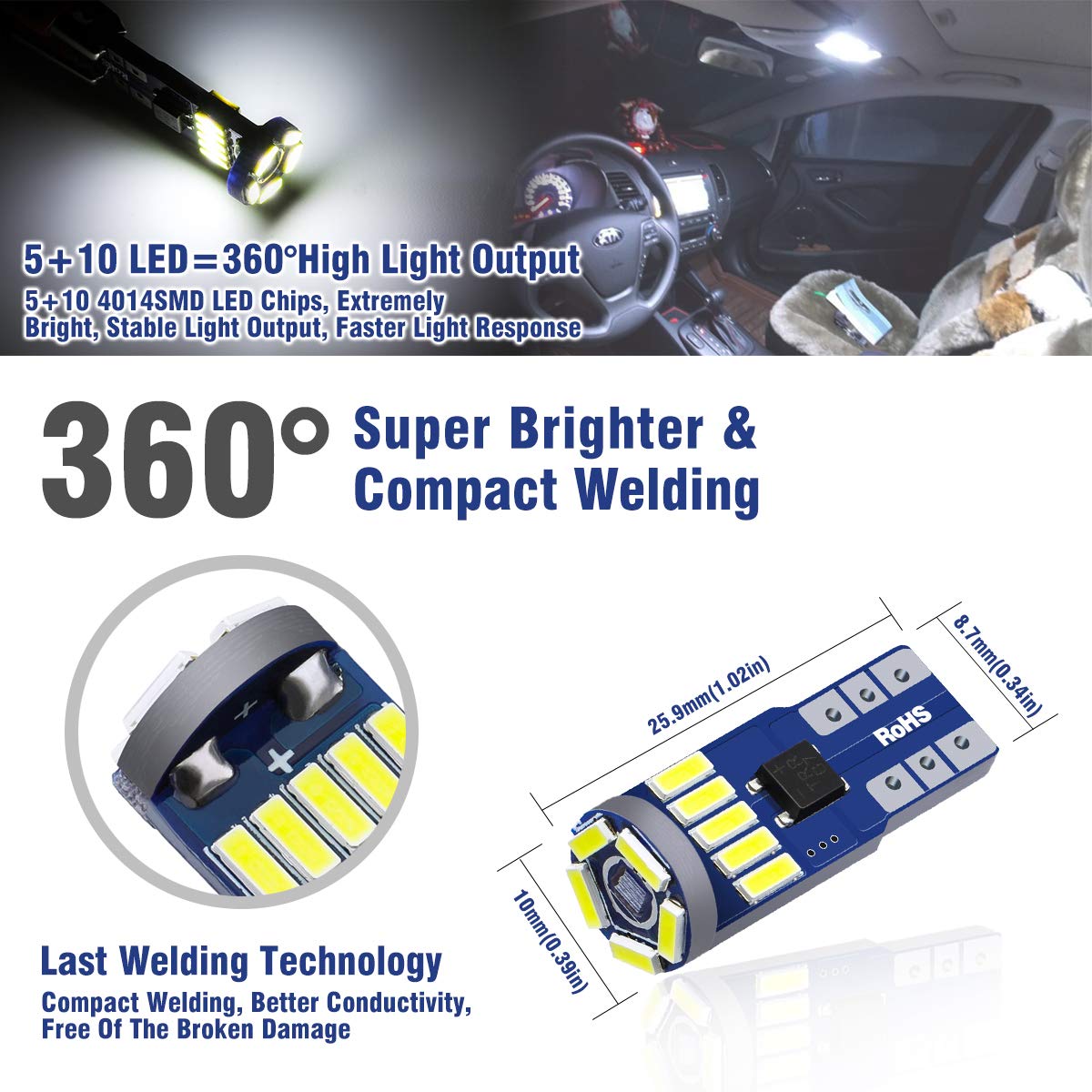 Audew 10 Pack Car LED Bulbs 15 4014SMD Wedge Lamp LED Light Bulbs for Car Vehicle Width Lamp Interior Lamps(White)
