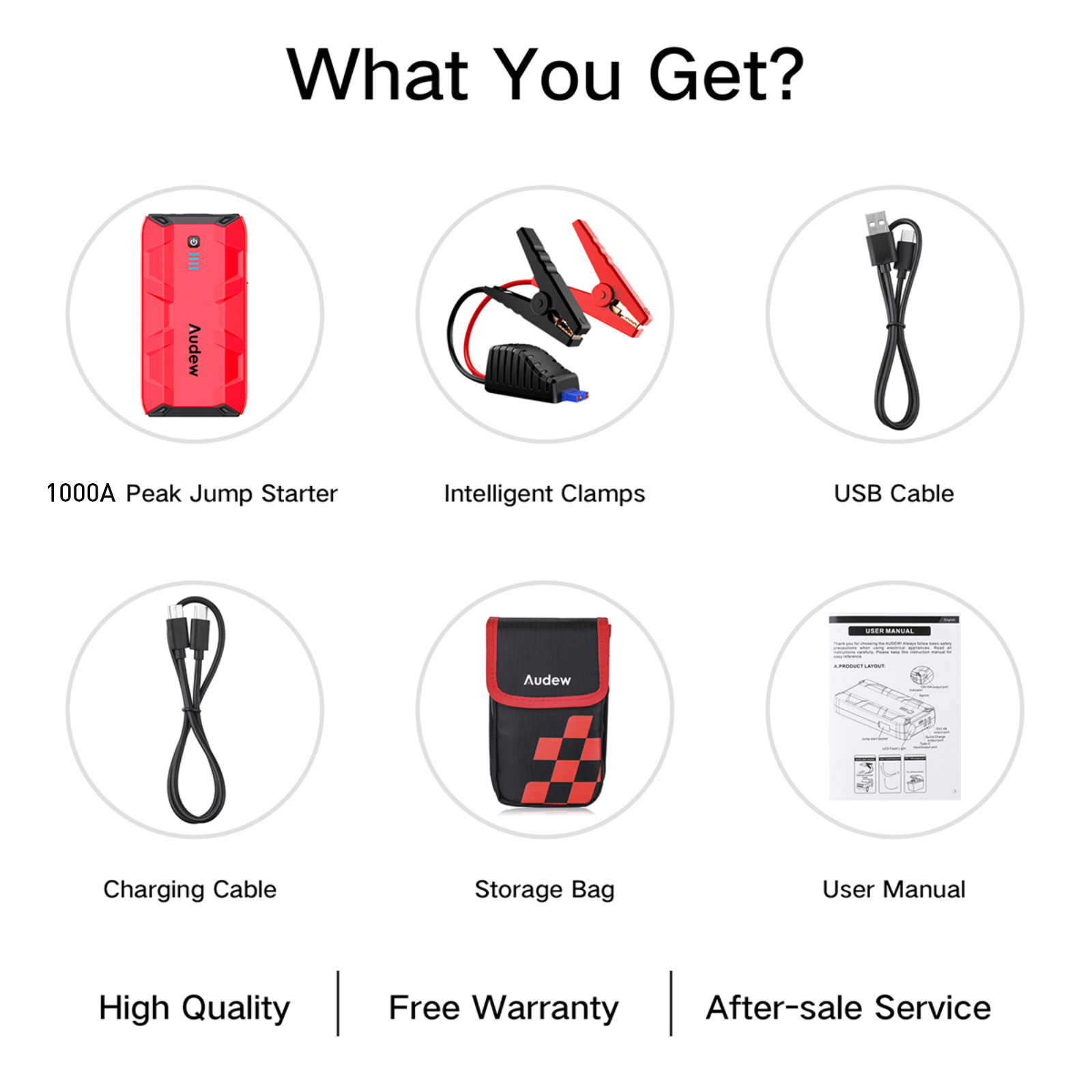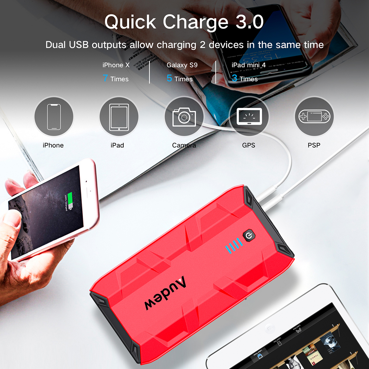 Audew jump starter uses high rate Li-ion battery instead of a normal one to makes it easier for you to start most 12V vehicles (up to 6.0L gas or 4.5L diesel or motorcycles, RV, tractor, lawnmower, speedboat, etc) up to 30 times with 1000 Amps peak utilizing for heavy-duty clamps and cables. Compact enough to store in your glove box or console.
