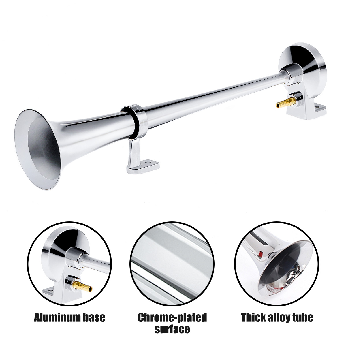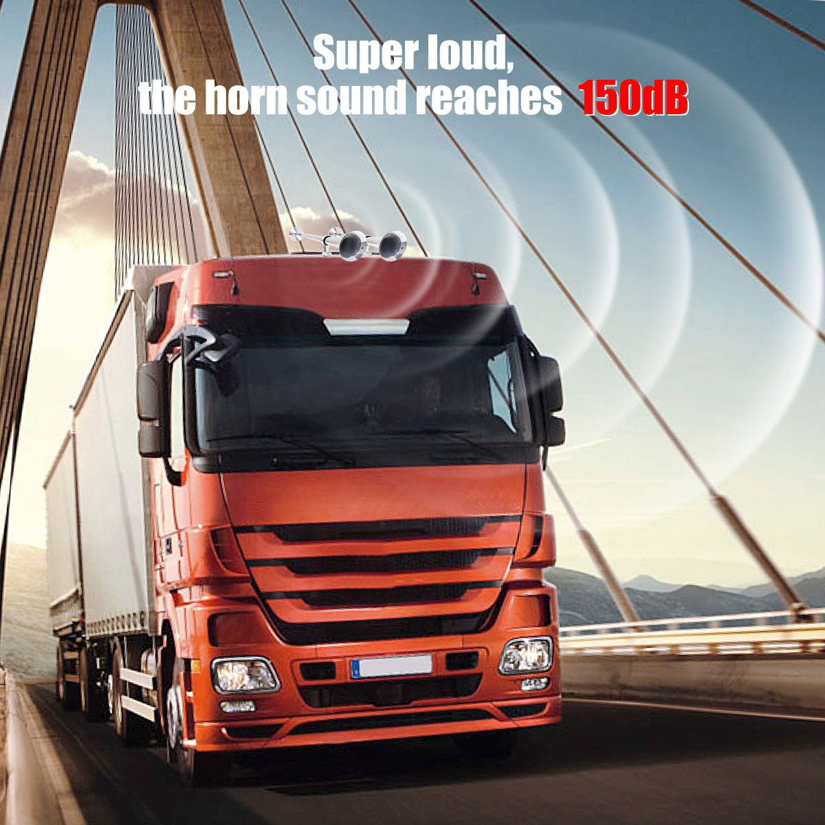 A powerful and loud: Single horn blares out a loud and powerful warning. The two durable trumpets can produce sound as loud as 150dB. The great powerful sound catches everyone's attention.