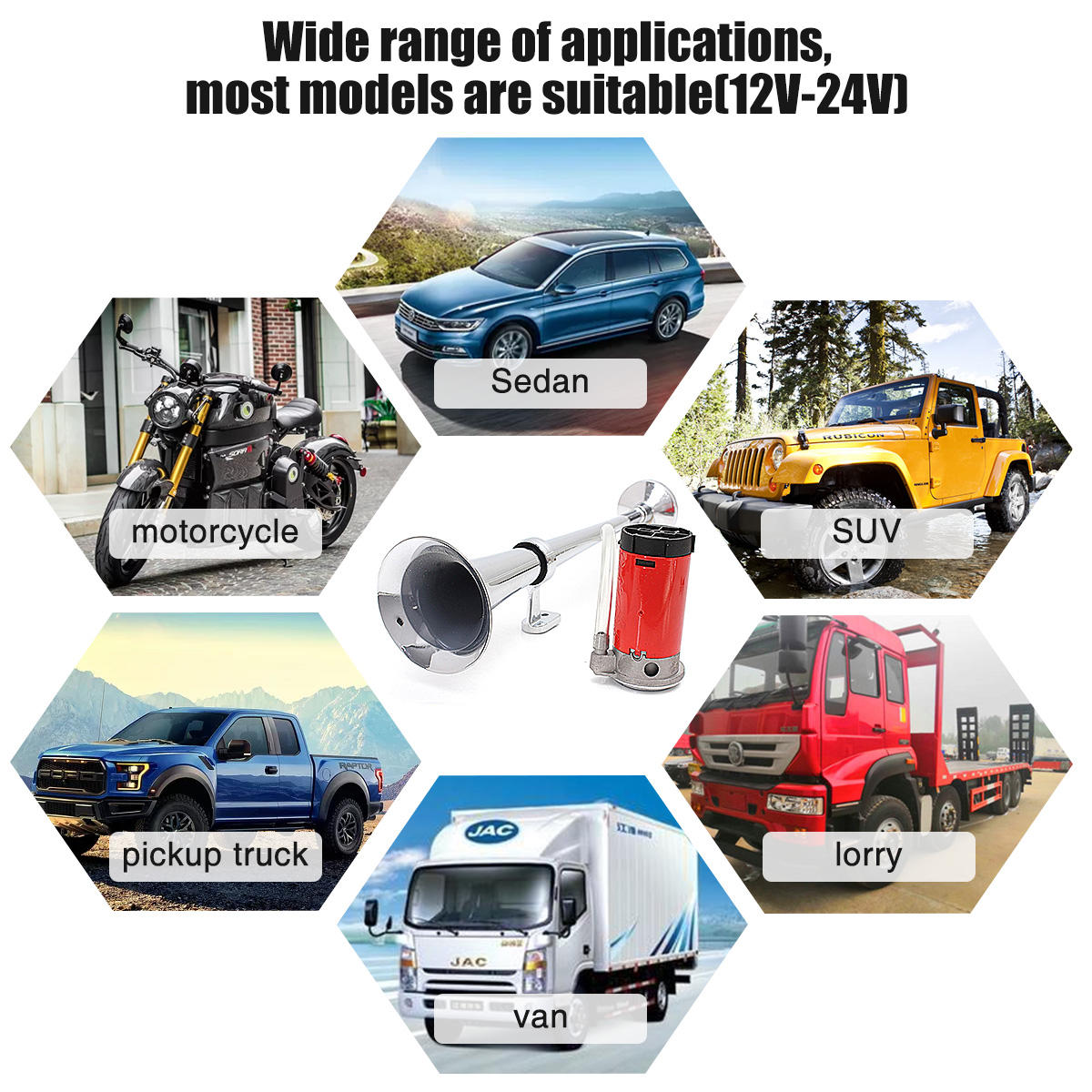 Versatility: Can be mounted on any application that has a 12V DC power available. With a polished red compressor and shiny chrome horn, they cast an eye-catching appearance on any vehicle-mounted.