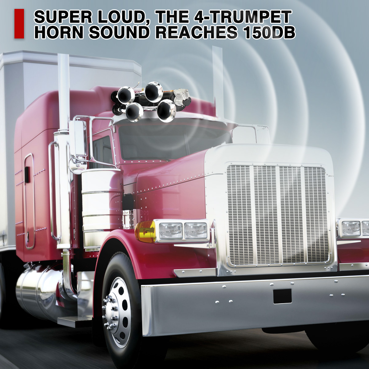 LOUD AIR HORN- Our air horn blares out a loud and powerful warning. The great bellowing sound catches pedestrians' attention and is heard all over. This four durable trumpets can produce sound as loud as 150 dB.