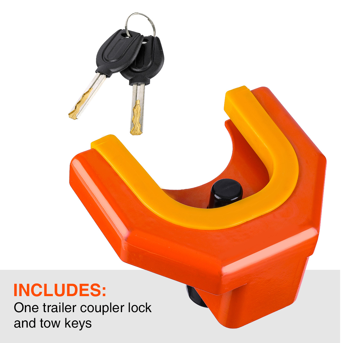 Universal coupler lock fits virtually all 1-7/8", 2", and 2-5/16" trailer couplers.