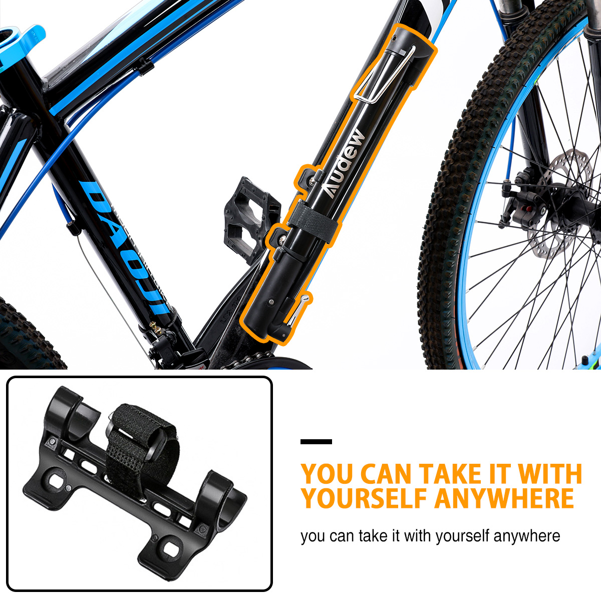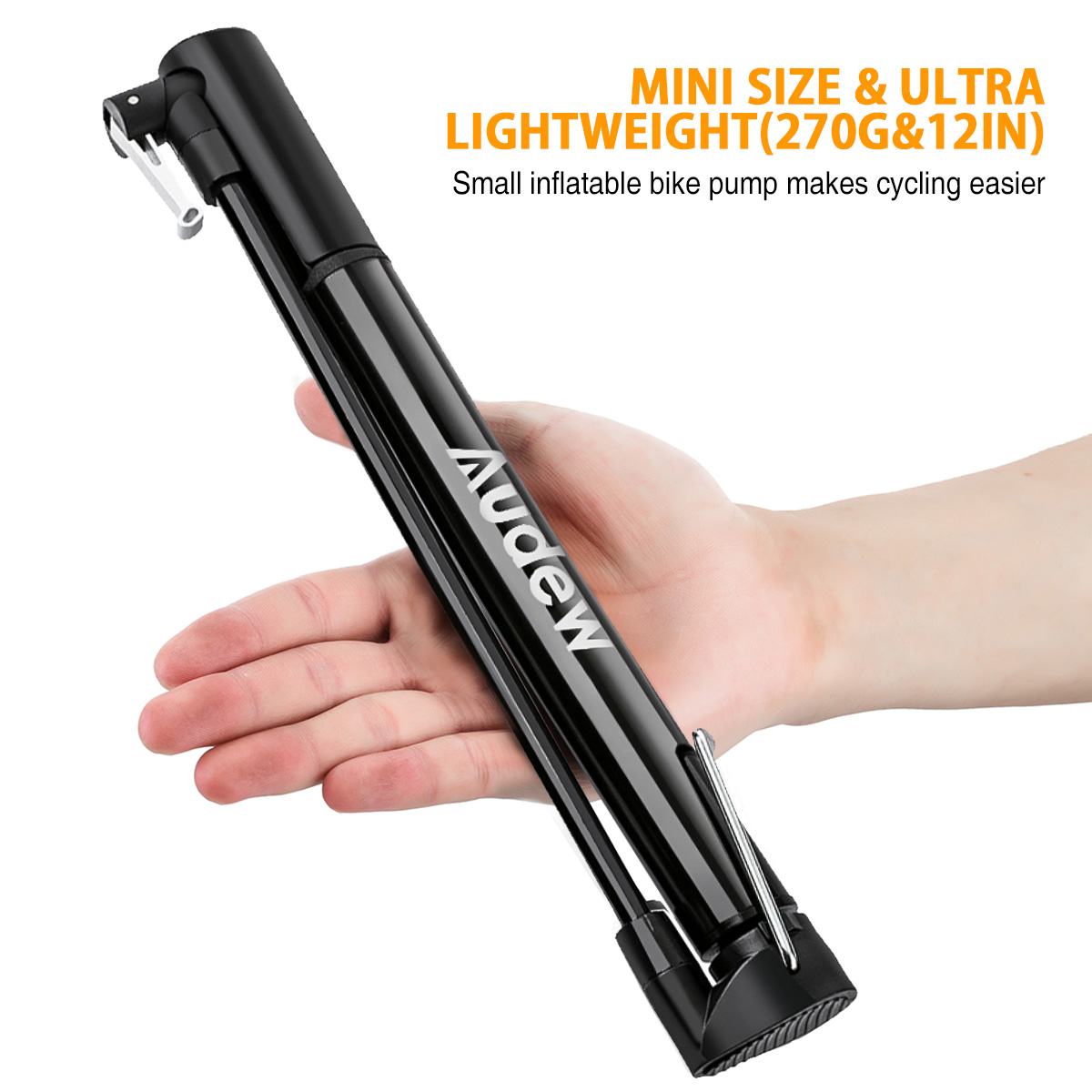 Audew mini bicycle pump weighs about 160g, it's durable but small enough to place in your bike bag easily. You can also mount it on the bike(it contains installation equipment).