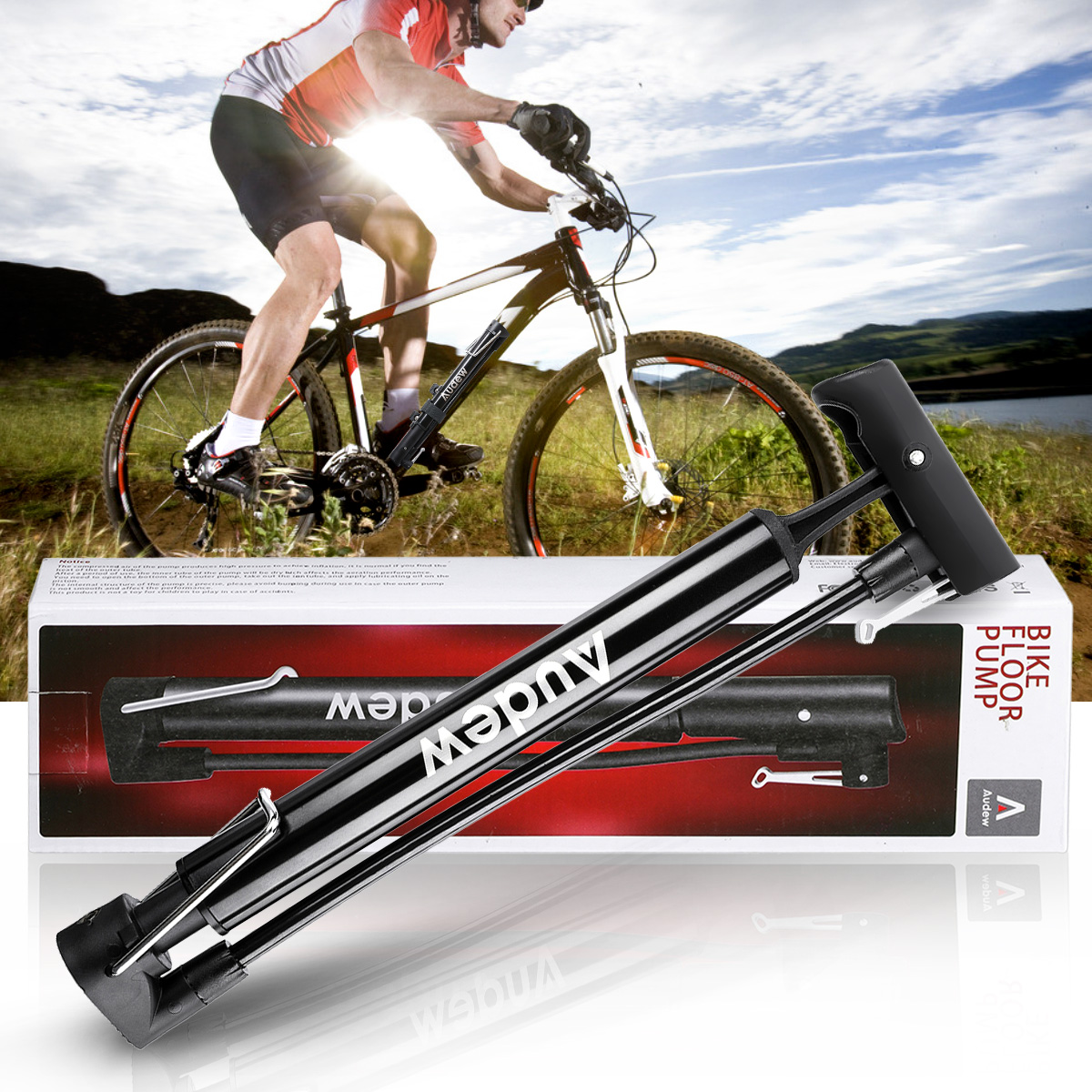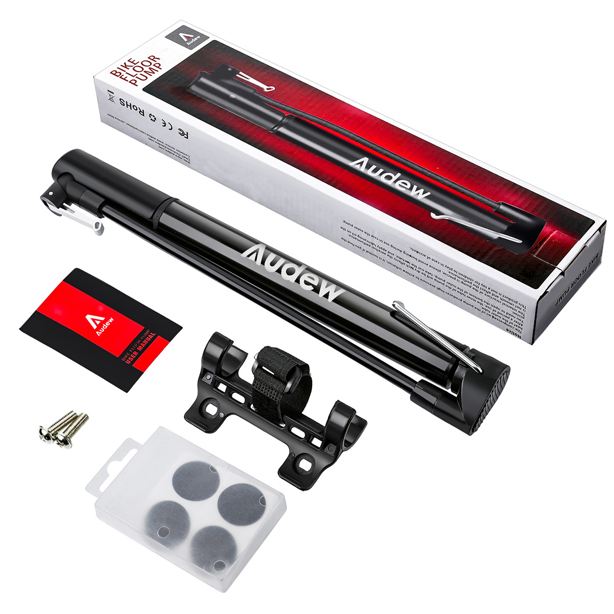 Audew bicycle pump provides you with ball needle, 2 bicycle air caps, glueless puncture repair kit, installation equipment. The complete kit will give you a better riding experience.