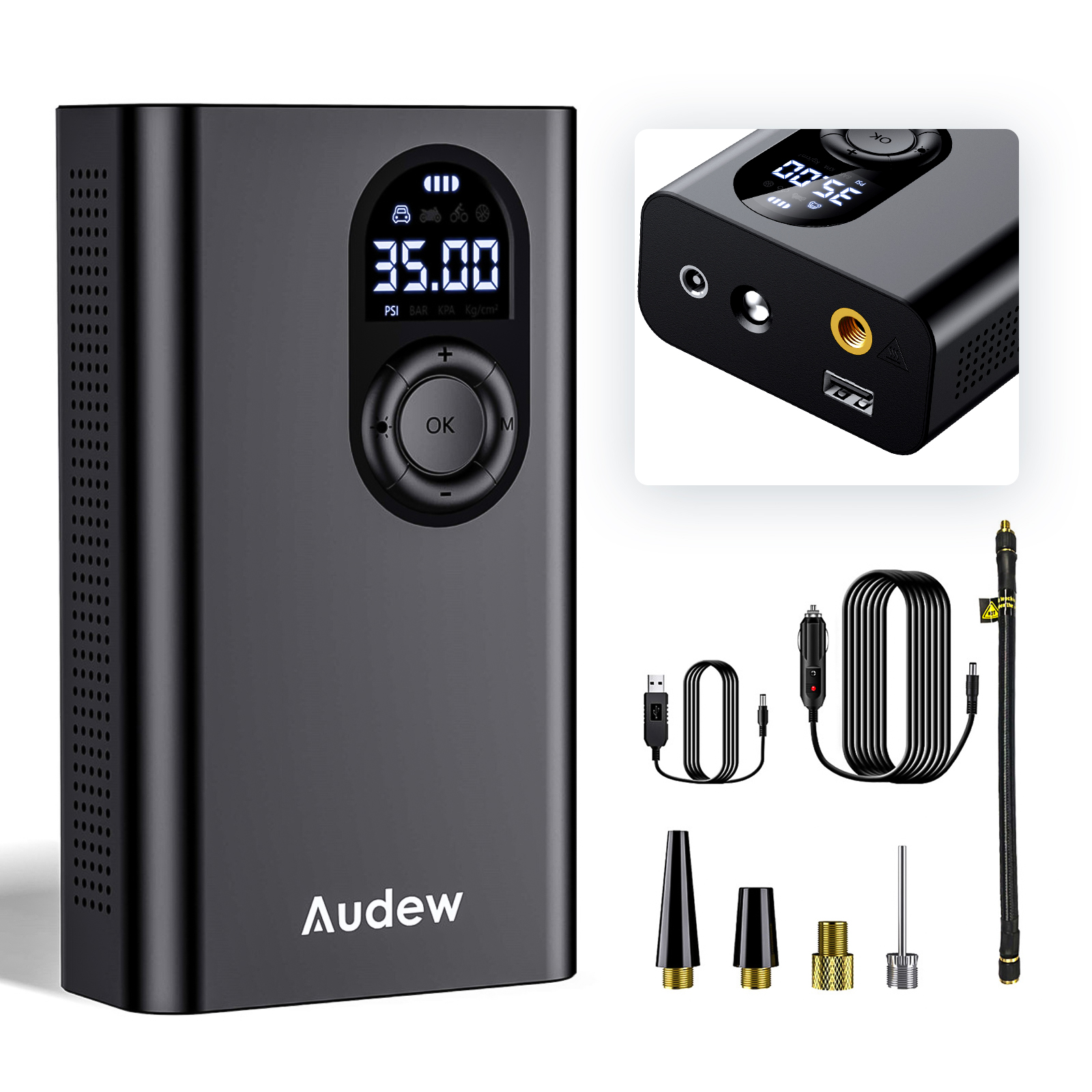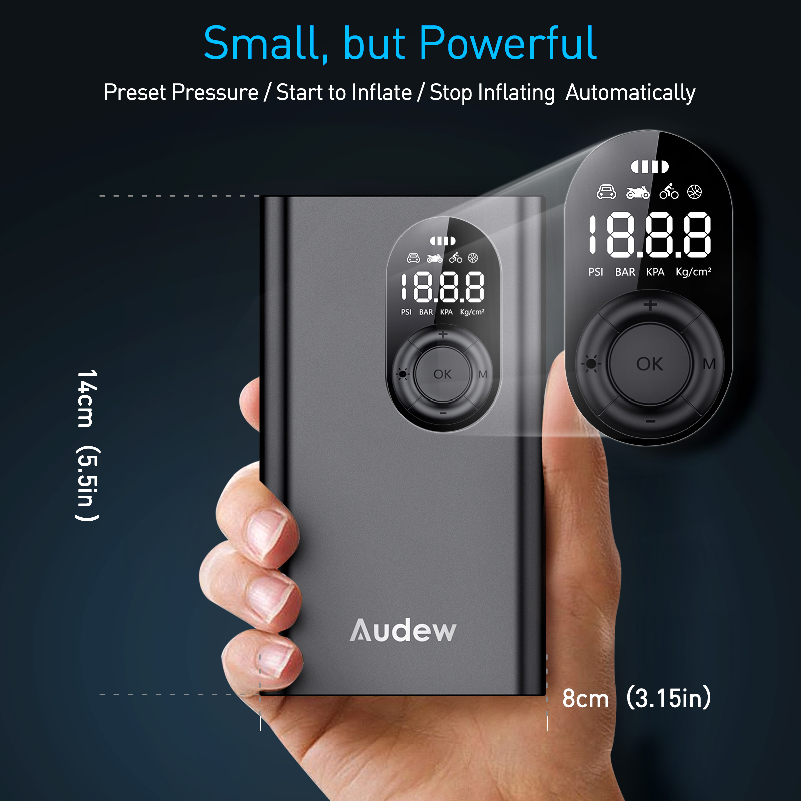 Air compressor could change the unit between PSI, BAR, KPA and KG/CM². There are also 4 preset modes ( Motor, Car, Bicycle & Ball ), you could easily choose the suitable mode basing on your need and it will start after pressing the "OK" button. The intelligent technology design will monitor the air pressure of the tyre during the inflation and automaticlly shut down once it reached the preset pressure.