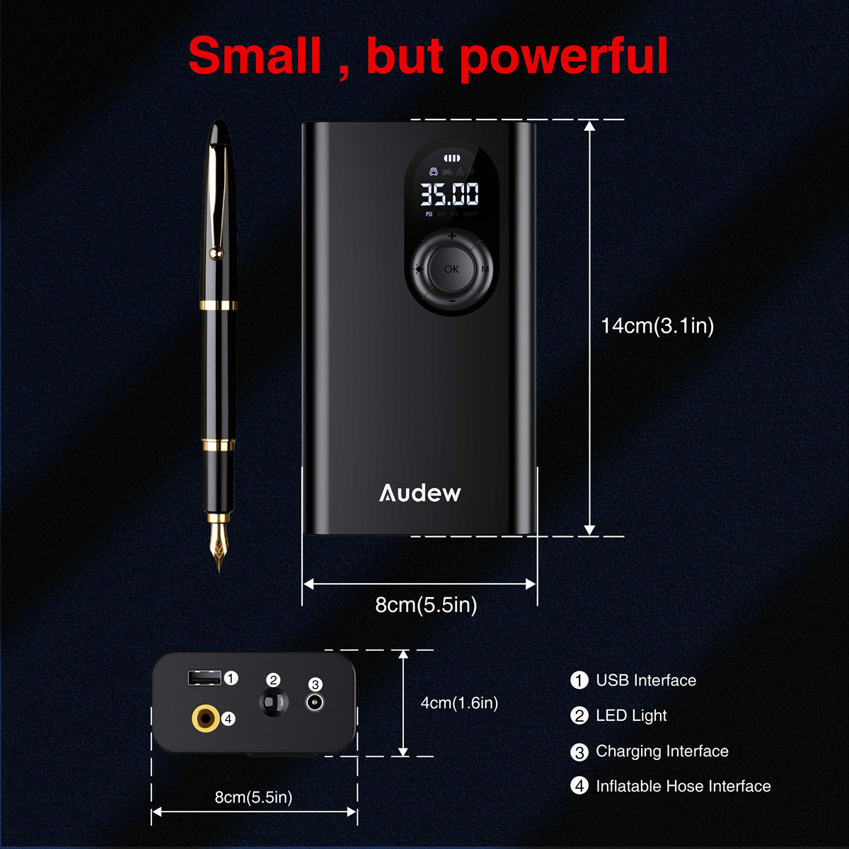 Electric bike pump mini has a size about 14*8*4cm and weight only about 900g. With such a mini size, it could be easily taken in your backbag when you go hiking or just set it in your car for the use of emergency.
