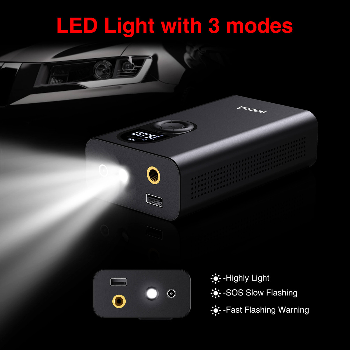 Tyre inflator is supplied with sufficient accessories which could be used for cars, balls, bicycles and inflatable toys. There are also one bright LED light coupled with the inflator, easily press the "sun" button to change it from " Lighting mode, slow flash mode and SOS mode. What's more, it could be also use as a power bank to charge your phone. If any further questions with the product, please contact with us and we will provide satisfying answer to you.