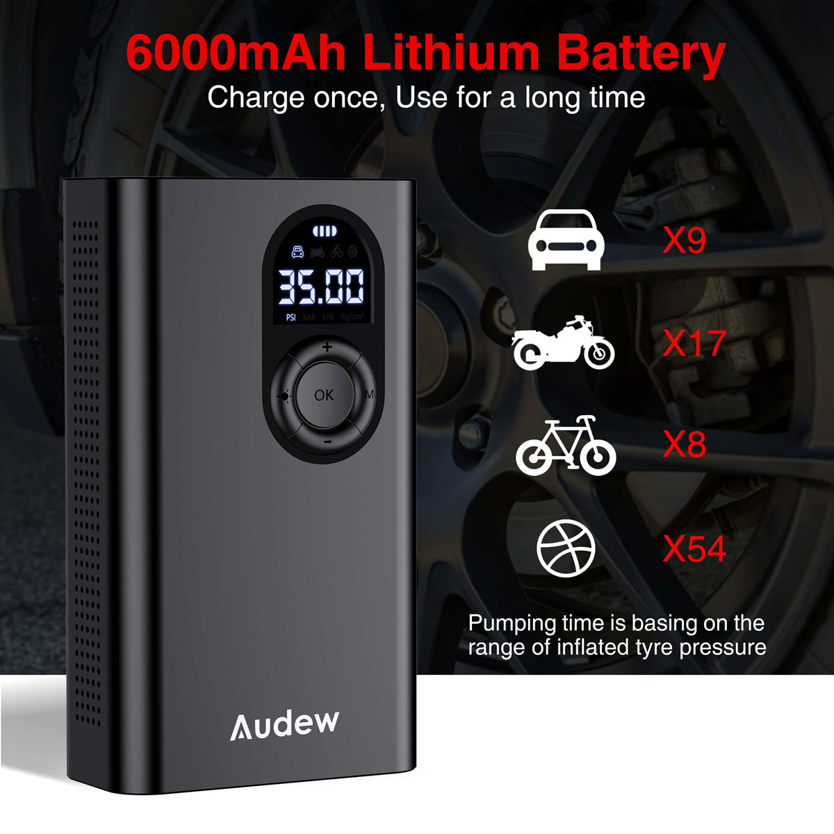 Longer using time! The air pump is equipped with 3*2000 mAh Built-in Lithium battery. It could air up for 9 car tyres or 17 motor tyres or about 54 balls after fully charged. Notice: We advise to connect the pump to your car with the cigarette lighter to ensure the best user experience when you try to air it.