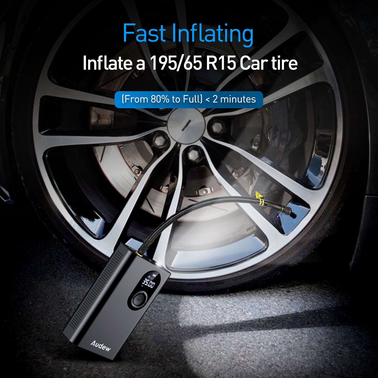 Audew electric air pump performs well in pumping up the tyres as you need. 150PSI powerful air pressure provides a faster inflating speed. It could saves your much time if you choose our tyre inflator, without the worry of long waiting.