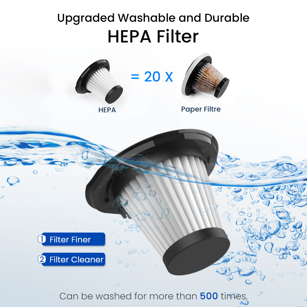 Reusable HEPA filter can be washed more than 500 times which is more durable than others.
