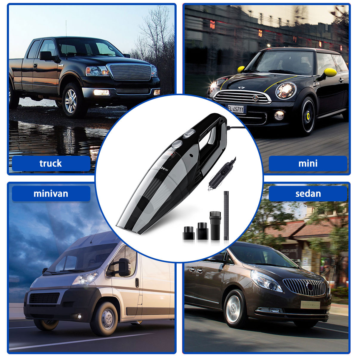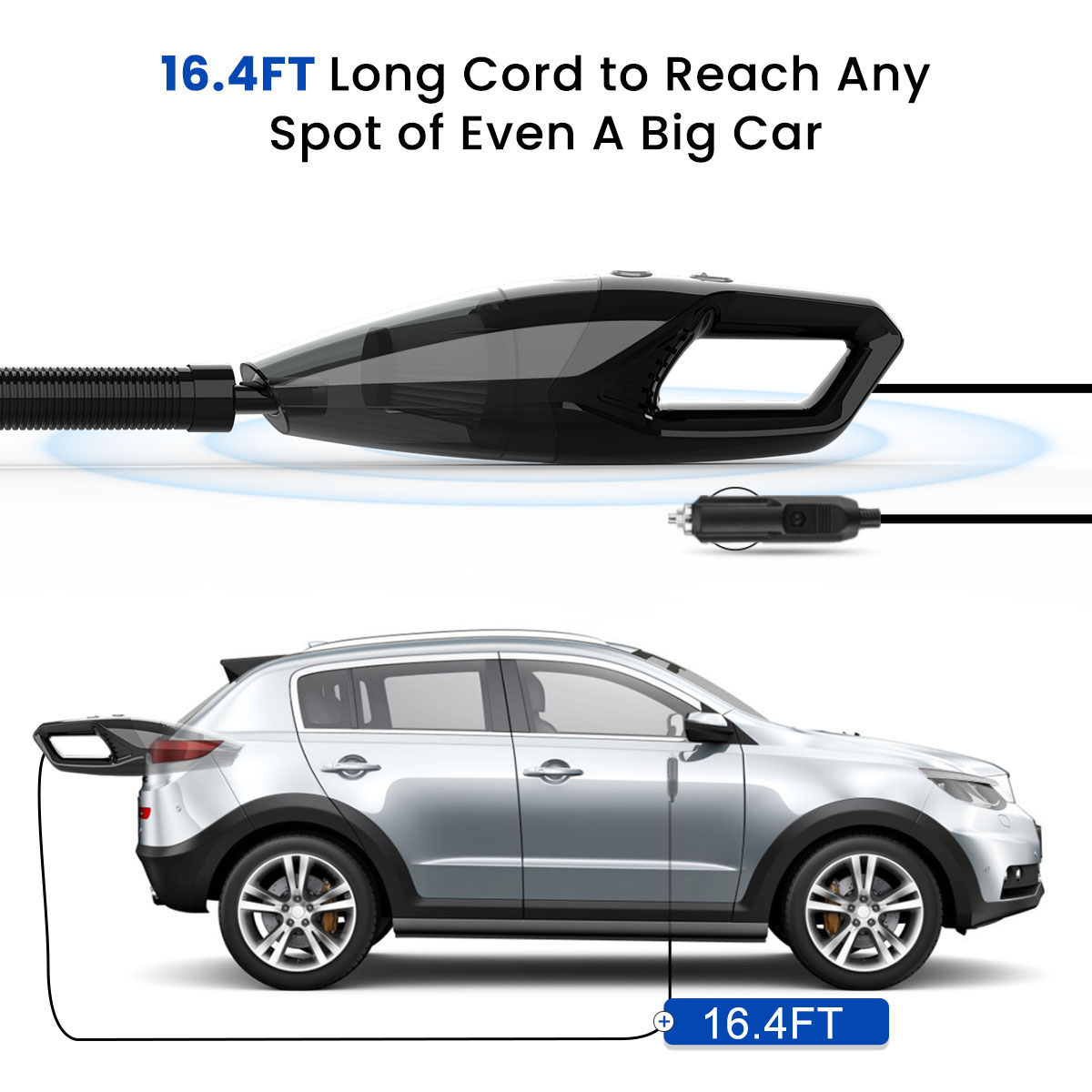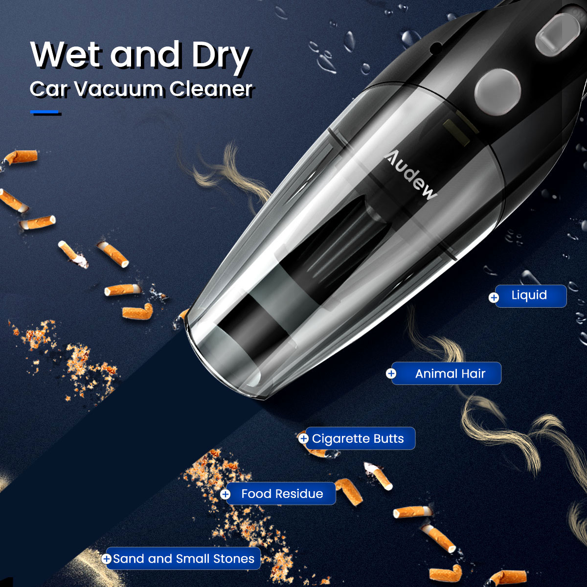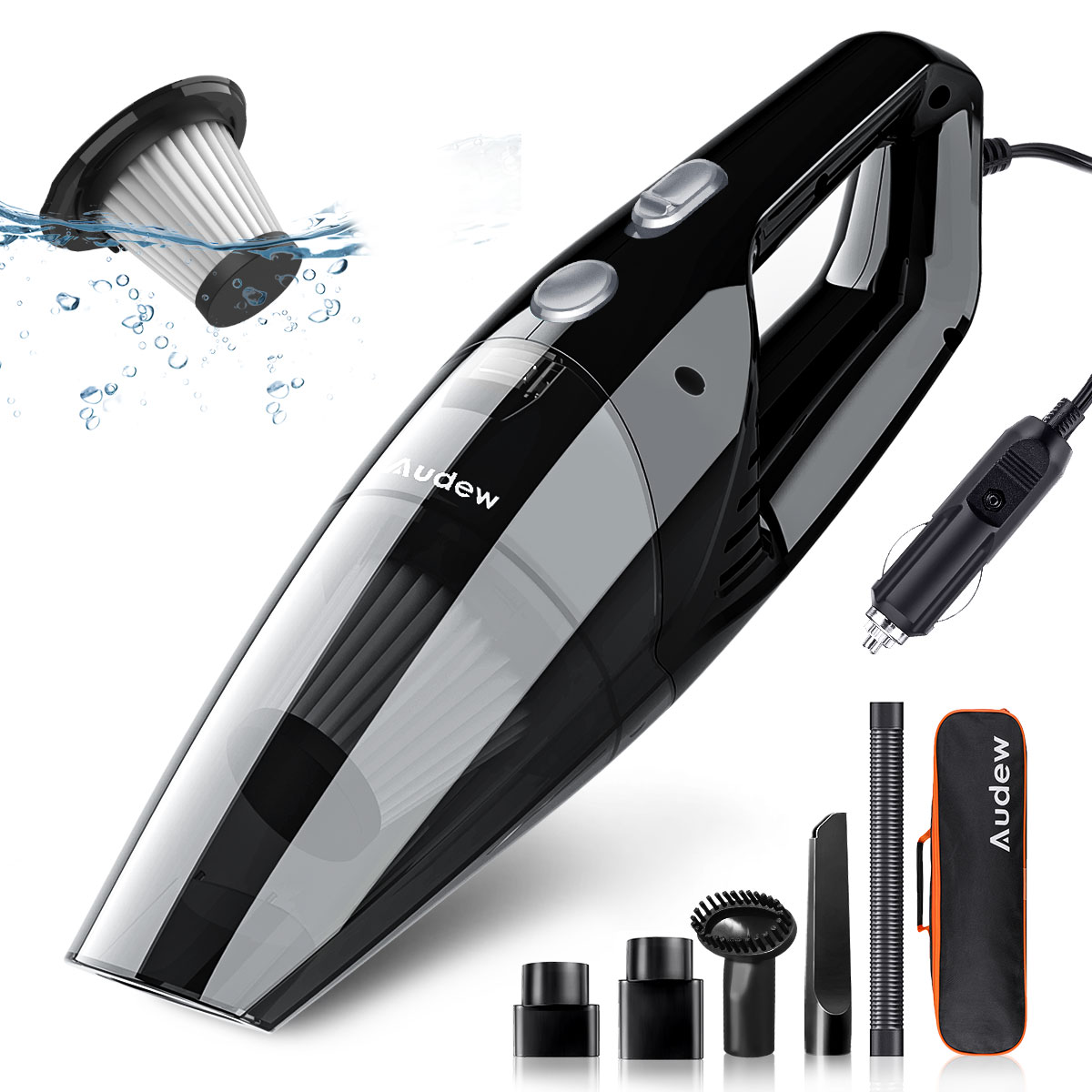 Audew Car Vacuum Cleaner with 8000Pa stronger suction, 100W high-performance motor, under 70 decibels low noise level, built-in cyclone technology, make the air and dust separate quickly without blocking the filter.