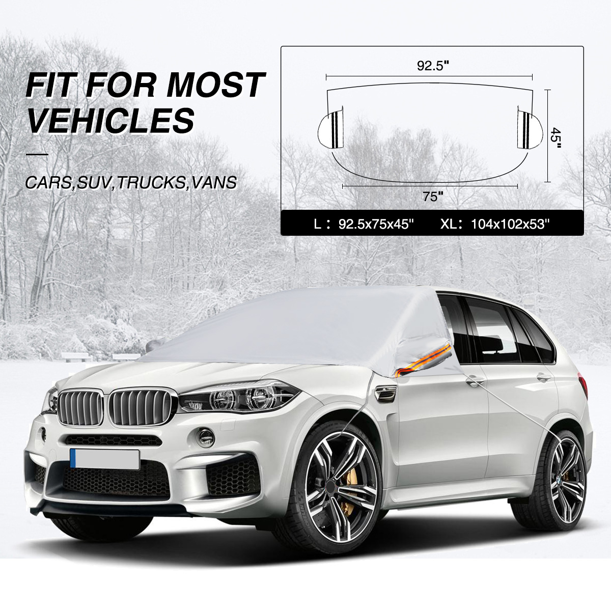This windshield cover is big and wide enough to cover a full-size SUV. We are in the New England area and there was a big snowstorm last week. With this cover, I was able to get the snow off very quickly and hit the road. The installation part is very tricky because you need to find the best way to fasten. You might need to wrap around the wheels a few times.